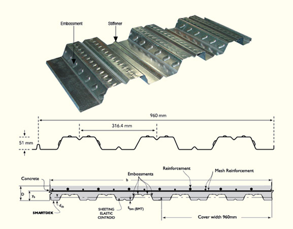 LYSAGHT® SMARTDEK® 51 Structural Decking System is an innovative “W” profile structural decking system. It offers greater economy and design freedom since it is precision engineered, and provides ease of use as well as safety. Its excellent spanning capabilities ensure greater strength and less deflection, specially suitable for construction of composite floor slab. SMARTDEK® 51 panel has a rib depth of 51 mm and provides an effective cover width of 960 mm. Embossments on top of the flange provide excellent mechanical interlocking between steel and concrete. In the assembled state, the profile comprises of intermediate male and female ribs for every interlocking side-lap joint.