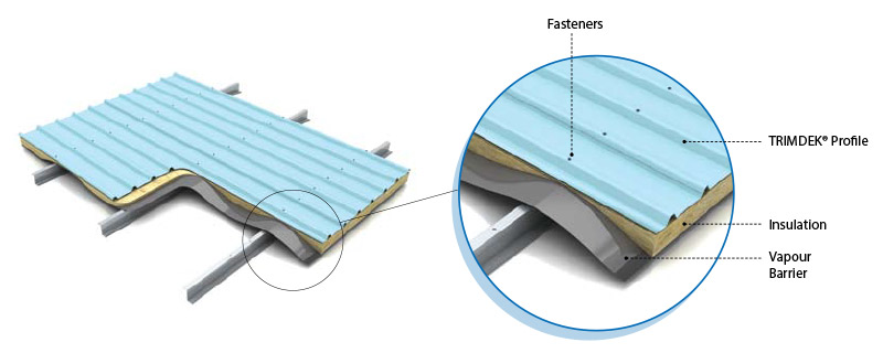 LYSAGHT® profiles can be used in Single Skin and Double skin Insulated Roof systems. LYSAGHT® roof and wall systems provide superior energy efficiency combined with aesthetic looks for the commercial construction sector. These systems are dependent on specific requirements and can be tailored to suit the thermal, acoustic, ventilation or economic requirements. Below are some Typical Insulated roof systems with LYSAGHT® roofing profiles.